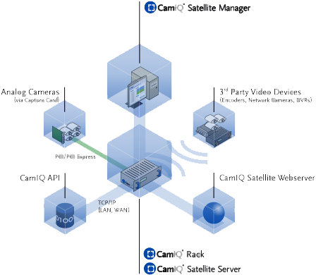 CamIQ Satellite ermöglicht die Integration von netzwerkbasierten Bildquellen (IP-Kameras, Encoder, Megapixel-Kameras) und klassischen CCTV-Kameras über Capture Cards in einem einheitlichen Hybridsystem. CamIQ Satellite löst die klassischen NVRs mit analoger Aufzeichnung und Erweiterungen für IP-Kameras ab, da für alle Bildquellen eine einheitliche Funktionalität bereitgestellt wird. Je nach verwendeter Hardwareplattform und geforderten Bildraten ist eine Nutzung mit bis zu 64 Kameras (davon 16 analoge Kameras über Capture Card) pro installiertem CamIQ Satellite Server möglich.